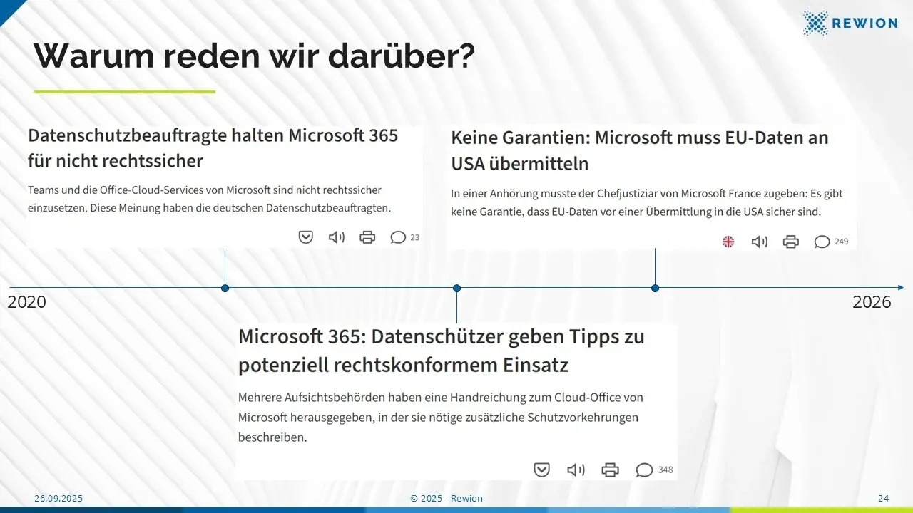 An der Nutzung von M365 führt oft kein Weg vorbei und dennoch handelt es sich hierbei um ein datenschutzrechtlich brisantes Thema. Die fehlenden Informationen der Aufsichtsbehörden führt dazu, dass Unternehmen in diesem Fall oft im Regen stehen gelassen werden. In unserem Webinar „Datenschutz beim Einsatz von M365“ möchten wir Licht in das Dunkel bringen und für Sie einordnen, welchen Herausforderungen Sie zu begegnen haben und wie Sie insbesondere technische und organisatorische Maßnahmen heranziehen können, um Verarbeitungsvorgänge von und mit Microsoft 365 datenschutzfreundlich beeinflussen zu können.