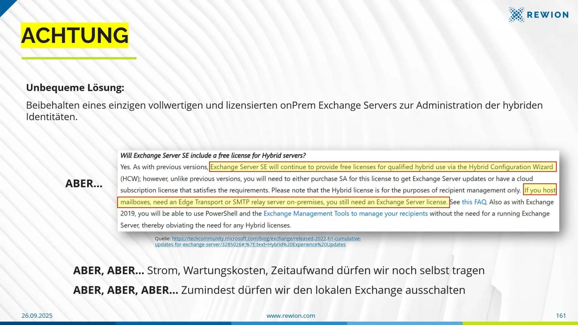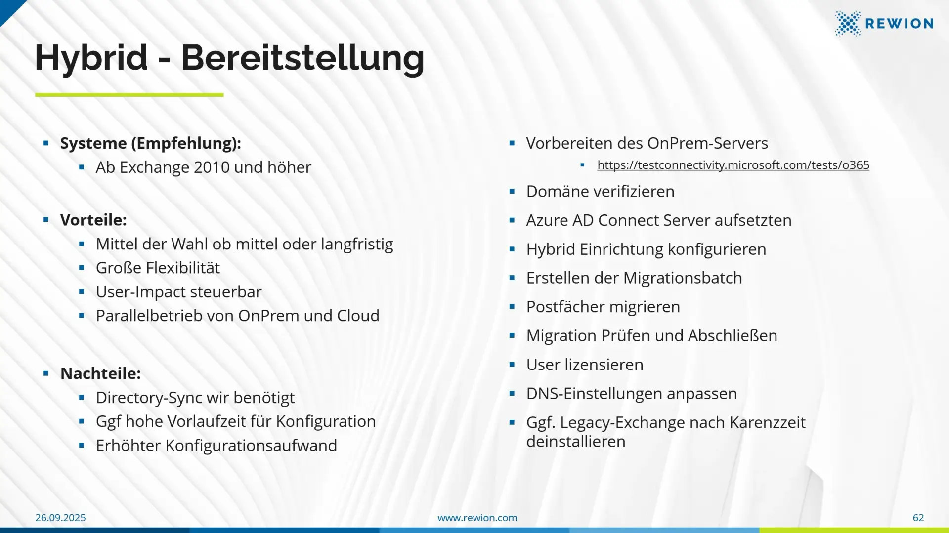 Unser 60-minütiges Webinar „M365 – Exchange Migration zu Exchange Online“ bietet Ihnen einen kompakten Einblick in das Thema Migration von Exchange in die Cloud. Sie erhalten einen Überblick über zentrale Aspekte, erfahren, welche Überlegungen in diesem Zusammenhang eine Rolle spielen und bekommen Anregungen, worauf es bei der Planung und Umsetzung grundsätzlich ankommt.