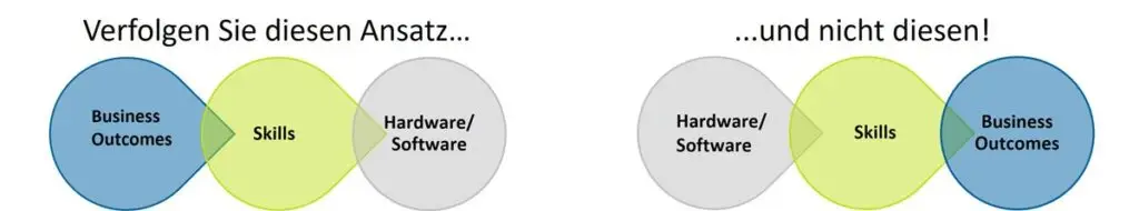 Neu wird nicht mehr von Hardware beziehungsweise Software zu Business Outcome, sondern von Business Outcome zu Hardware / Software gedacht. Je nachdem was man erreichen möchte, sind spezifische Skills notwendig, die durch Unterstützung geeigneter Hard- und Software optimal eingesetzt werden können.