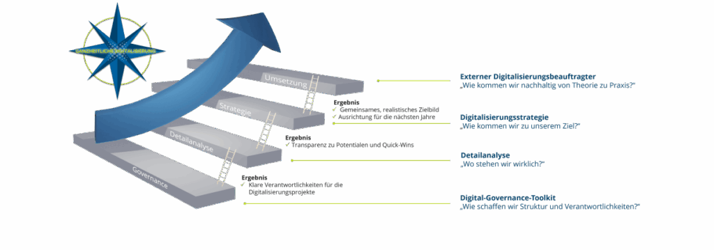 Mit unserem Stufenmodell begleiten wir Krankenhäuser Schritt für Schritt auf dem Weg der digitalen Transformation – von Governance und Analyse über Strategie bis hin zur erfolgreichen Umsetzung. So schaffen wir Struktur, Transparenz und Nachhaltigkeit für Ihre Digitalisierungsprojekte.