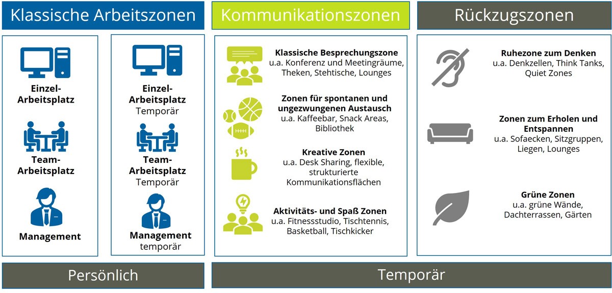 Als Grundlage für produktive, kreative und erfolgreiche Arbeit gilt der Arbeitsort. Mitarbeiter sollen sich am Arbeitsplatz wohlfühlen und entfalten können. Umgesetzt wird das beispielsweise in unterschiedlichen Zonen auf einem offenen Etagenplan statt zahlreicher Einzelbüros. Es gibt Zonen zur ungestörten Arbeit, zum gemeinsamen Arbeiten wie für Brainstormings und Projekte, sowie Besprechungsräume für Meetings jeglicher Art. Ein solches Modern Workplace Konzept soll sich an die flexiblen Anforderungen der Mitarbeiter anpassen.