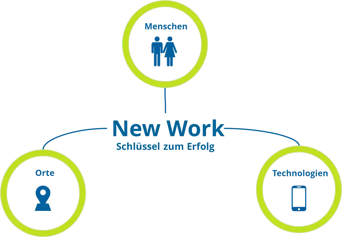 New Work besteht aus drei Dimensionen: Mensch, Ort und Technologie. Nur wenn diese drei Dimensionen im Einklang sind, kann das Konzept erfolgreich umgesetzt werden.