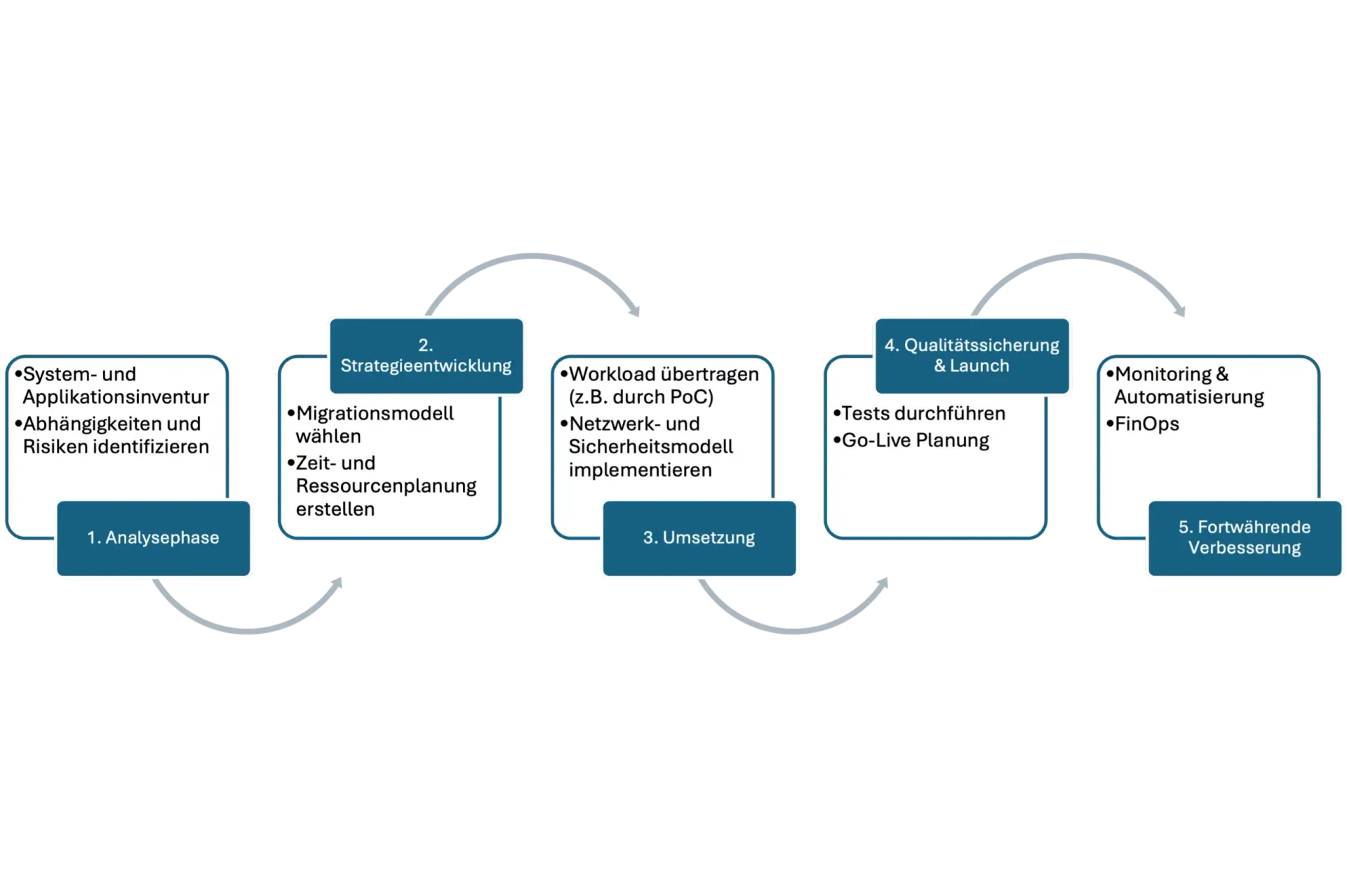 Unser Beratungsangebot „Effiziente Cloud Migration“ begleitet Unternehmen systematisch bei der Überführung ihrer IT-Landschaft in die Cloud. Wir schaffen Transparenz über die bestehende Infrastruktur, definieren eine maßgeschneiderte Migrationsstrategie und unterstützen bei Architekturdesign, Pilotierung, Implementierung sowie dem nachhaltigen Betrieb und der Optimierung nach der Migration.