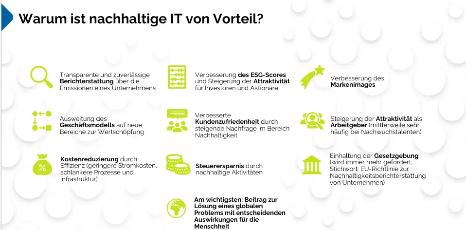 Mit der Sustainable IT Foundation schaffen wir das organisatorische Fundament, um IT-Nachhaltigkeit in Ihrem Unternehmen wirksam zu gestalten. Wir helfen Ihnen, Zuständigkeiten klar zu regeln, Entscheidungsprozesse zu beschleunigen und Nachhaltigkeit fest in der IT-Strategie zu verankern. Nach dem Workshop sind Sie bereit, Maßnahmen strukturiert umzusetzen und Erfolge messbar zu machen.