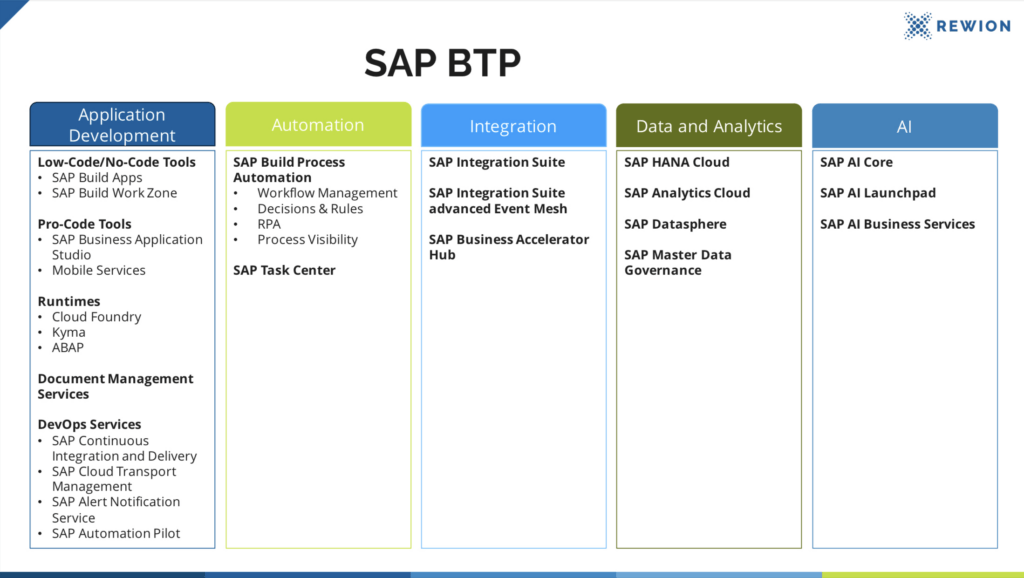 Die SAP Business Technology Platform (SAP BTP) stützt sich auf fünf grundlegende Säulen, die das Herzstück ihrer Funktionalität bilden. Lassen Sie uns einen genaueren Blick auf jede dieser Säulen werfen: